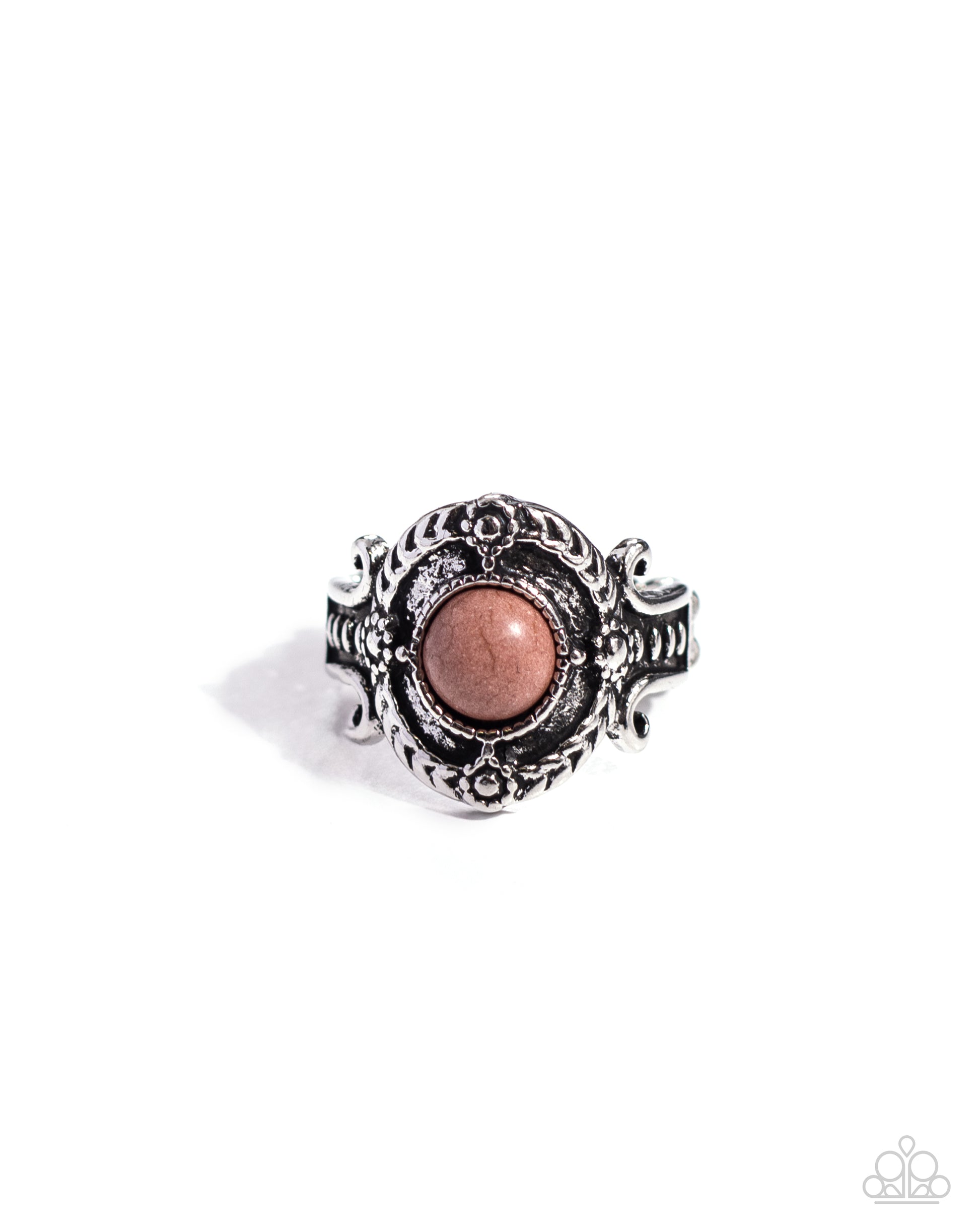 A grounding Meerkat stone is pressed into the center of a silver frame embossed and stamped in glistening floral and textured details for a seasonal flair. Features a stretchy band for a flexible fit. As the stone elements in this piece are natural, some color variation is normal.