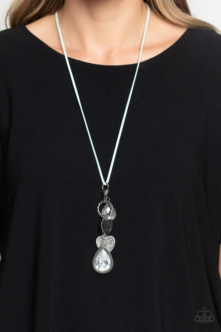 Dangling from the bottom of an elongated aqua suede string, a lobster clasp closure holds an eclectic collection of shimmer and shine. Featured on the lobster clasp, varying sizes of white teardrop gems pressed into silver studded frames, varying sizes of silver hearts brushed in an antiqued pattern, and a ring brushed in a cobblestone-like pattern create a whimsical refinement down the neckline. Features an adjustable clasp closure.