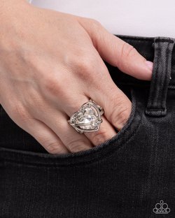 Pronged in the center of an airy silver heart frame, a white cubic zirconia heart glistens atop the finger for a romantic centerpiece. A solitaire, silver-pronged white rhinestone dots across a bar of silver that crisscrosses atop the heart frame for a Cupid-inspired finish. Features a stretchy band for a flexible fit.
