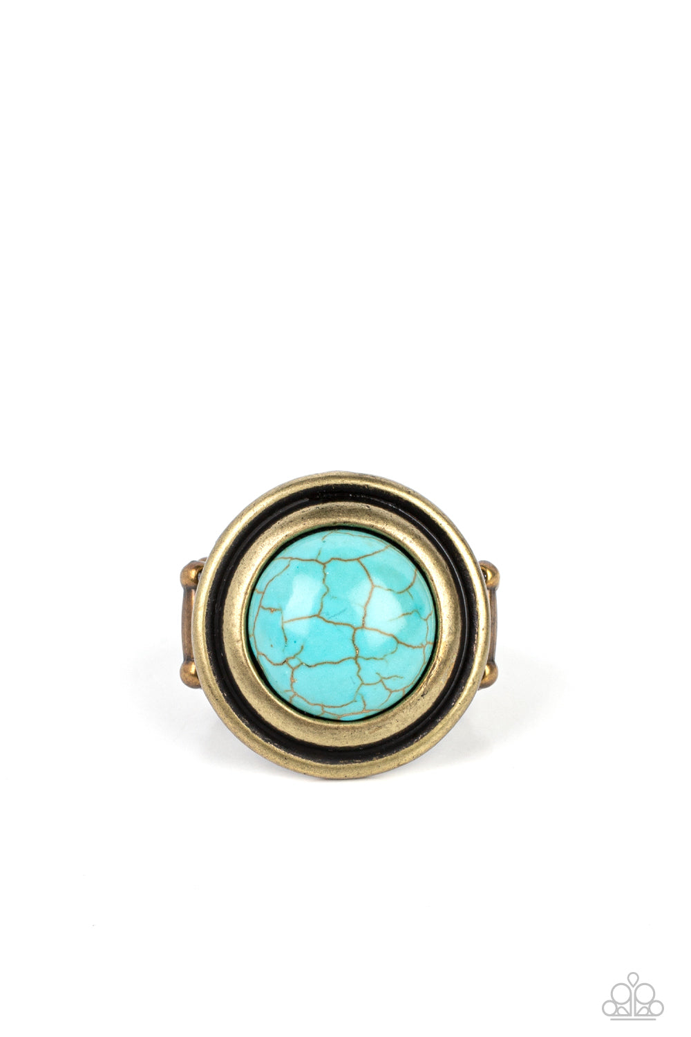Hang on to your hats! Celebrate your unique style with this stunning, oversized brass ring. The statement piece features a cool turquoise stone floating in an open brass frame - and it's all set off by hand-hammered detailing around the edges. Wear yours on its own or stacked with other rings for a fresh take on jewelry design that turns heads as you walk down the street.