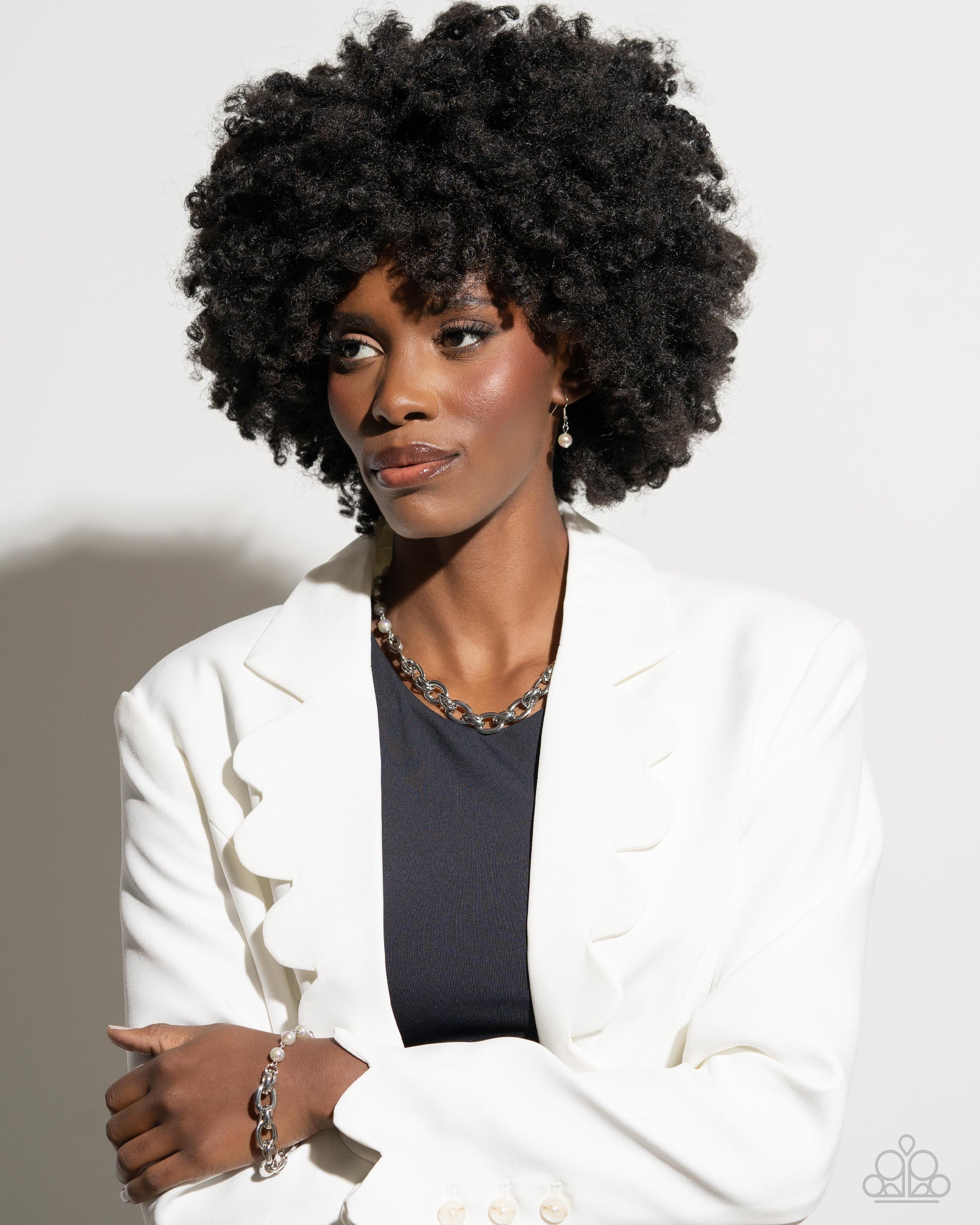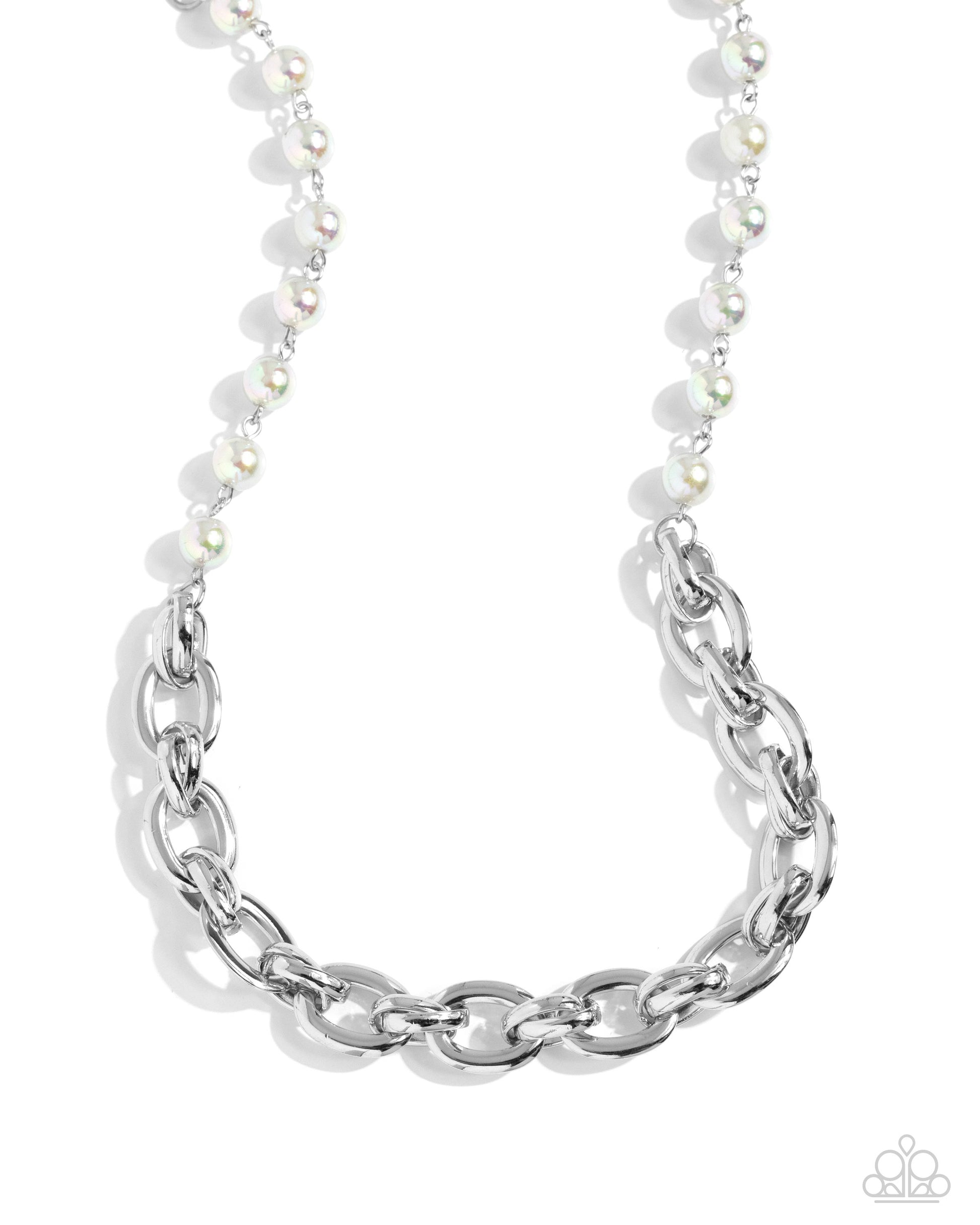 Gleaming white pearls combine with oversized silver links to create a half-and-half fashionable mashup down the neckline for a refined, carefree finish. Features an adjustable clasp closure.