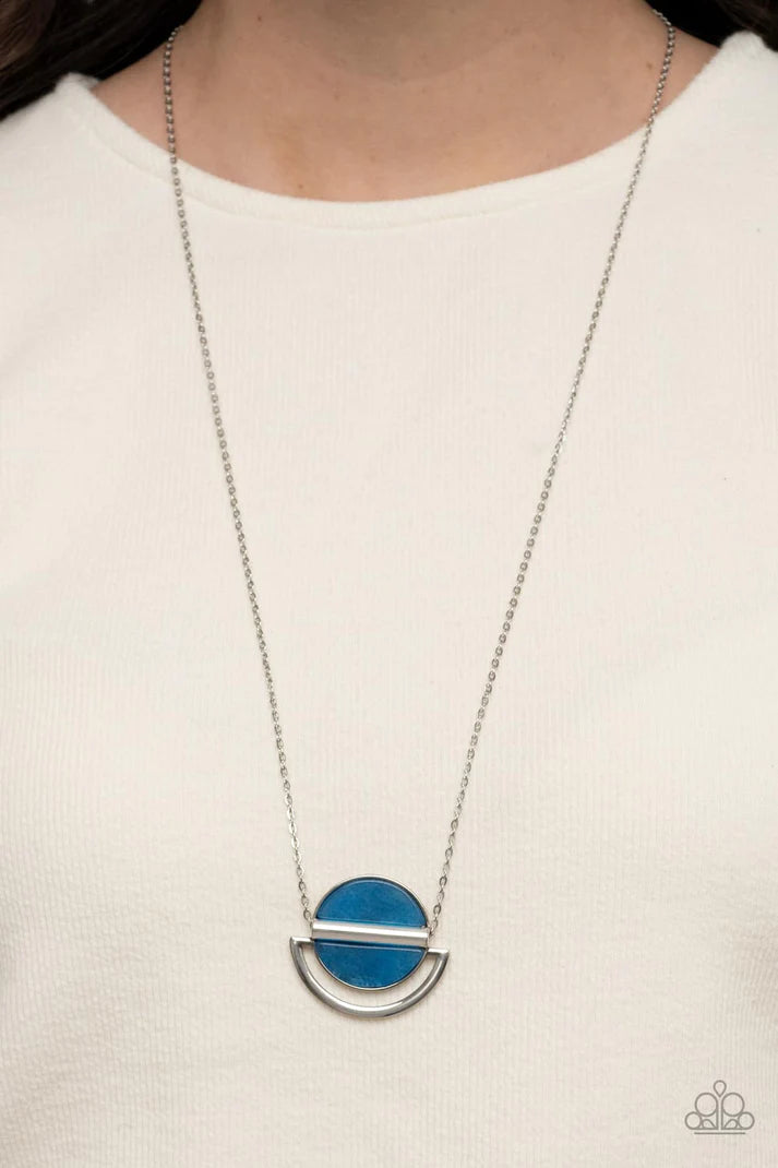 A pair of blue acrylic half moon frames are separated by a shiny silver bar at the bottom of a crescent shaped silver frame, resulting in an ethereal pendant at the bottom of an extended silver chain. Due to the nature of the materials, colors may vary. Features an adjustable clasp closure.