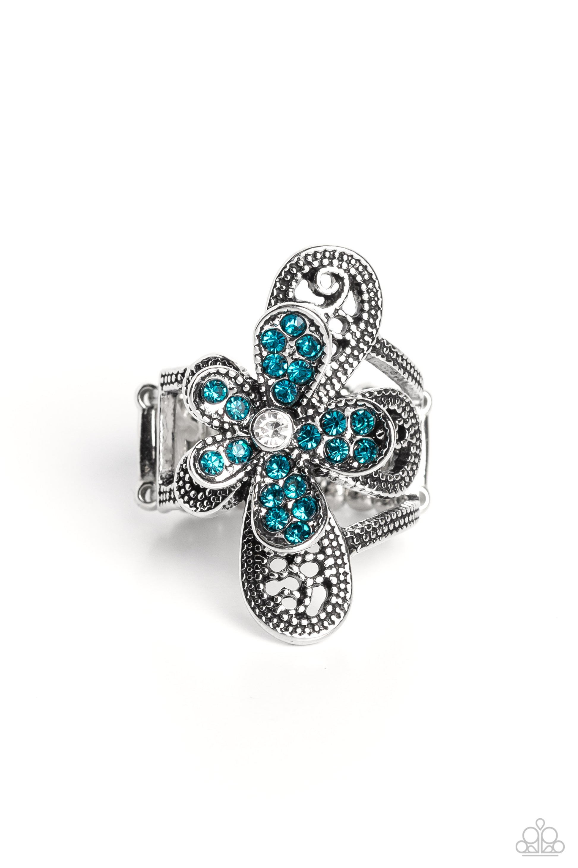Dotted with a dainty white rhinestone center, silver petals overlaid with glittery blue rhinestones, sit atop studded silver filigree petals, creating a frilly floral centerpiece atop the finger. Features a stretchy band for a flexible fit.