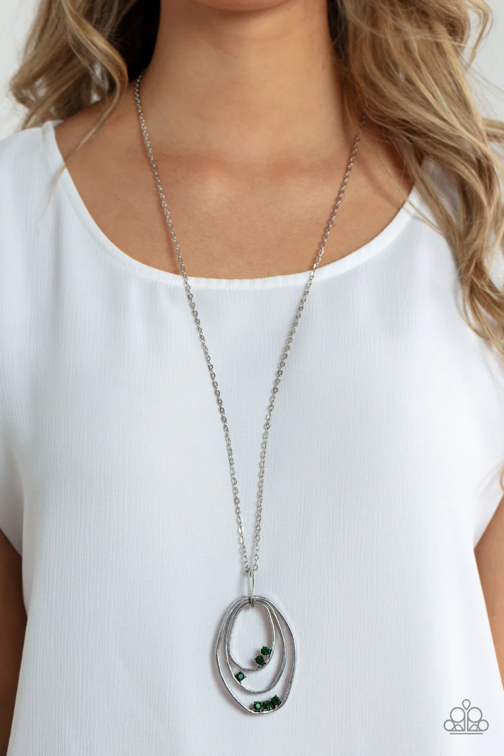Glittery Leprechaun rhinestones are haphazardly sprinkled along three asymmetrical and hammered silver ovals, creating a dizzying pendant at the bottom of an extended silver chain. Features an adjustable clasp closure.