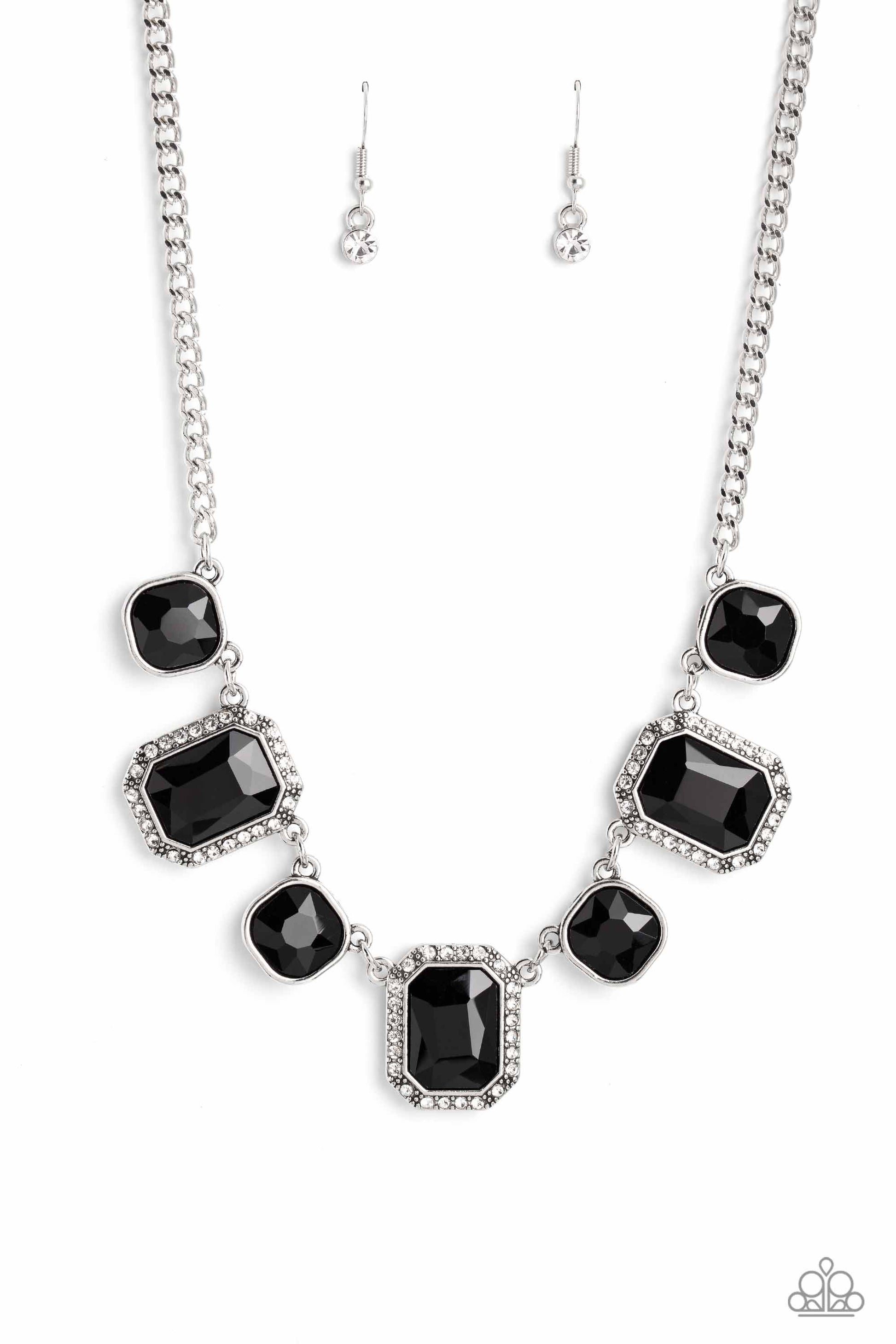 Dazzling gems, in both round and emerald-cuts, fall along the collar in an alternating pattern. Each gem is splashed in a dauntless, jet black hue amplifying its impact, while the emerald-cut gems showcase some glittery bling with a border of tiny white rhinestones. Features an adjustable clasp closure.