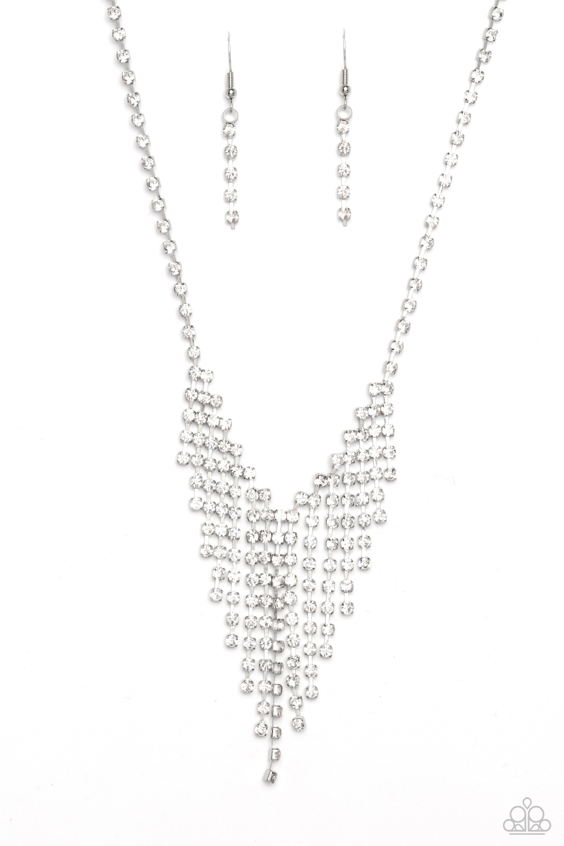 Featuring a sleek silver square fitting chain, glittery strands of white rhinestones stream down the chest for a refined flair. Varying in length, strands of white rhinestones encased in similar silver square fittings stem from the sparkly chain creating a statement-making fringe. Features an adjustable clasp closure.