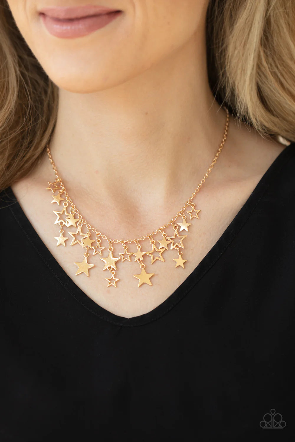 A mismatched collection of shiny gold stars cascade from a dainty gold chain, creating a stellar fringe below the collar. Features an adjustable clasp closure.