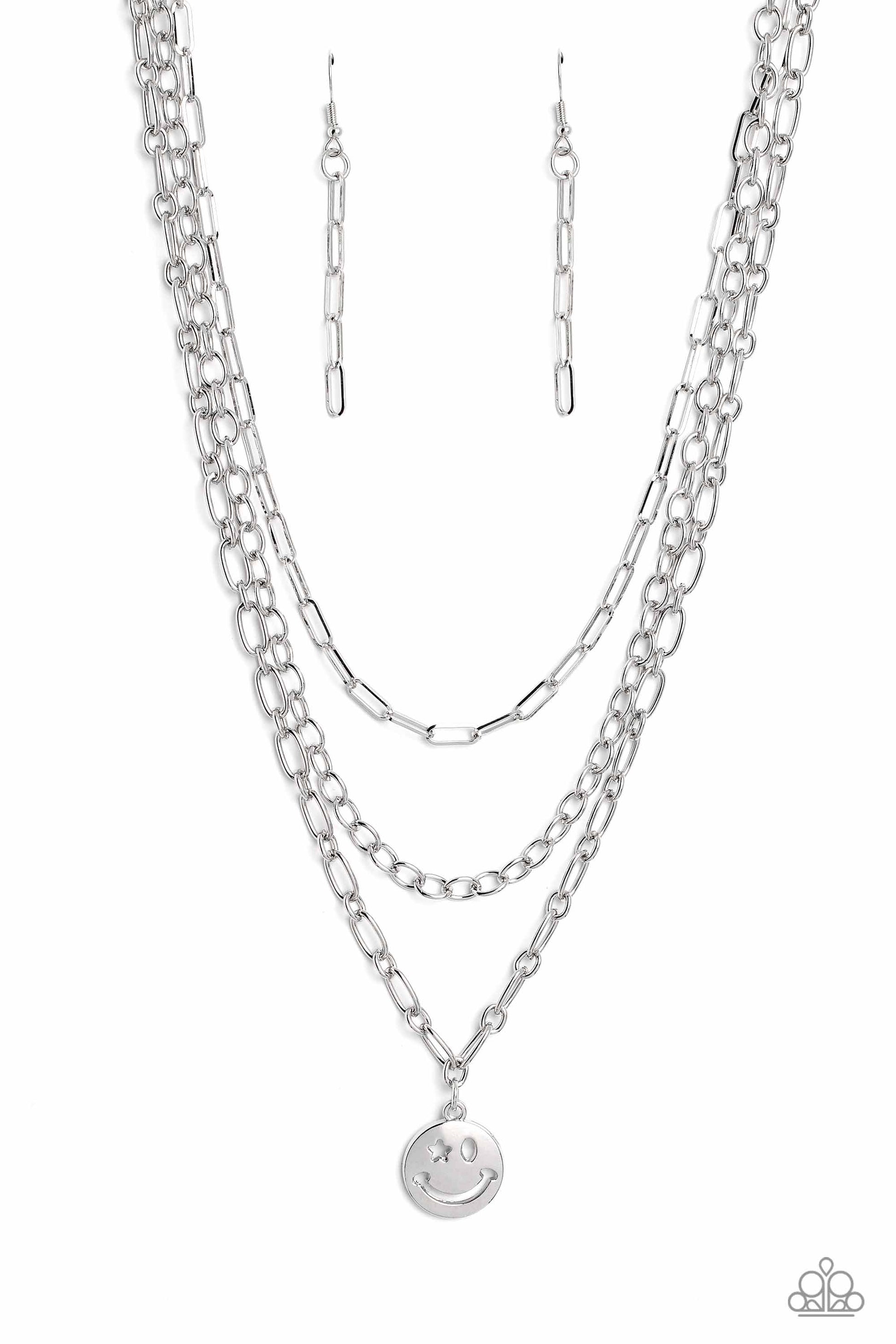 A trio of silver paperclip, classic, and oval link chains coalesces down the neckline for a monochromatic masterpiece. Strung on the lowermost oval link chain, a silver smiley face pendant, with a star mimicking a wink for one of its eyes, stands out and reflects light in every direction for a statement finish. Features an adjustable clasp closure.